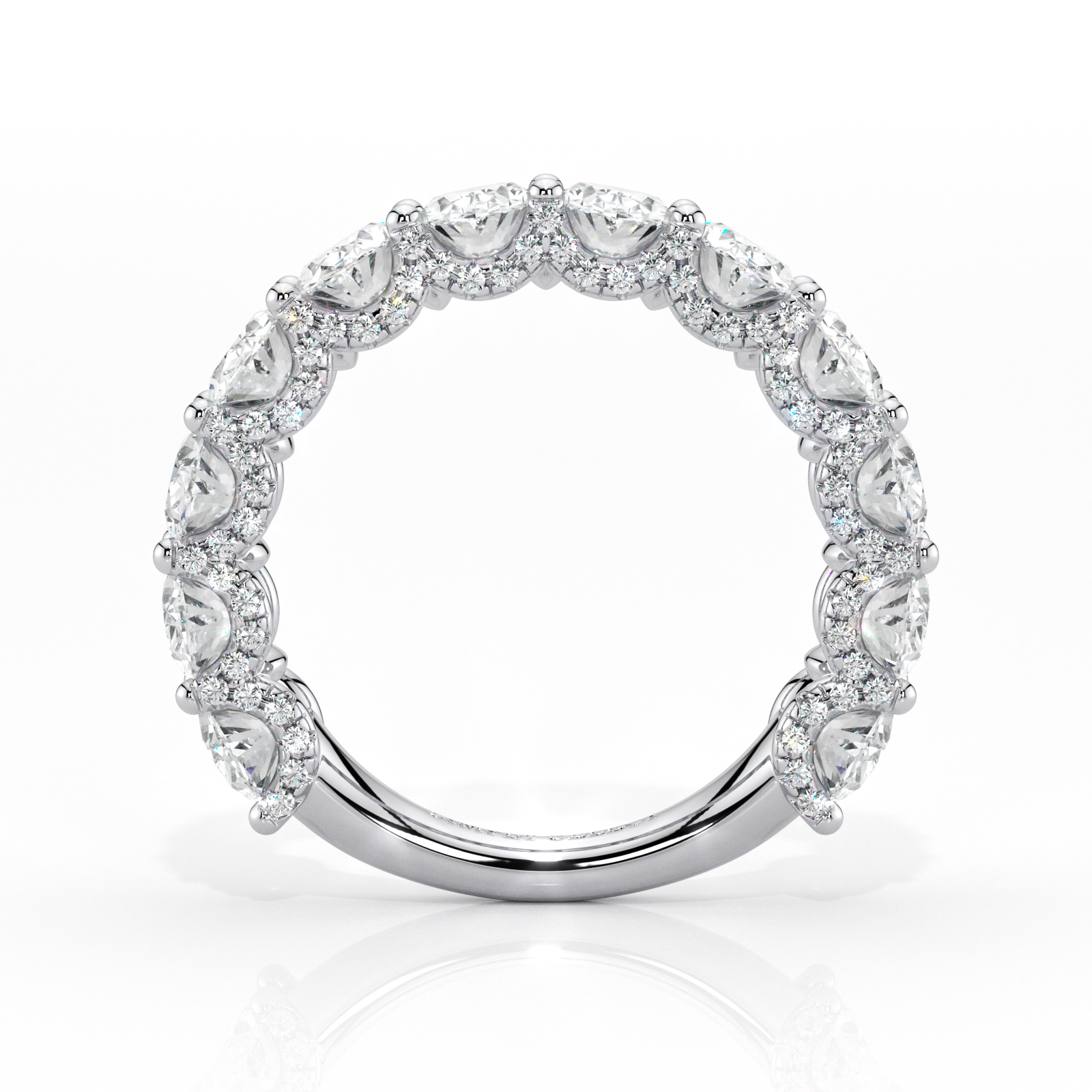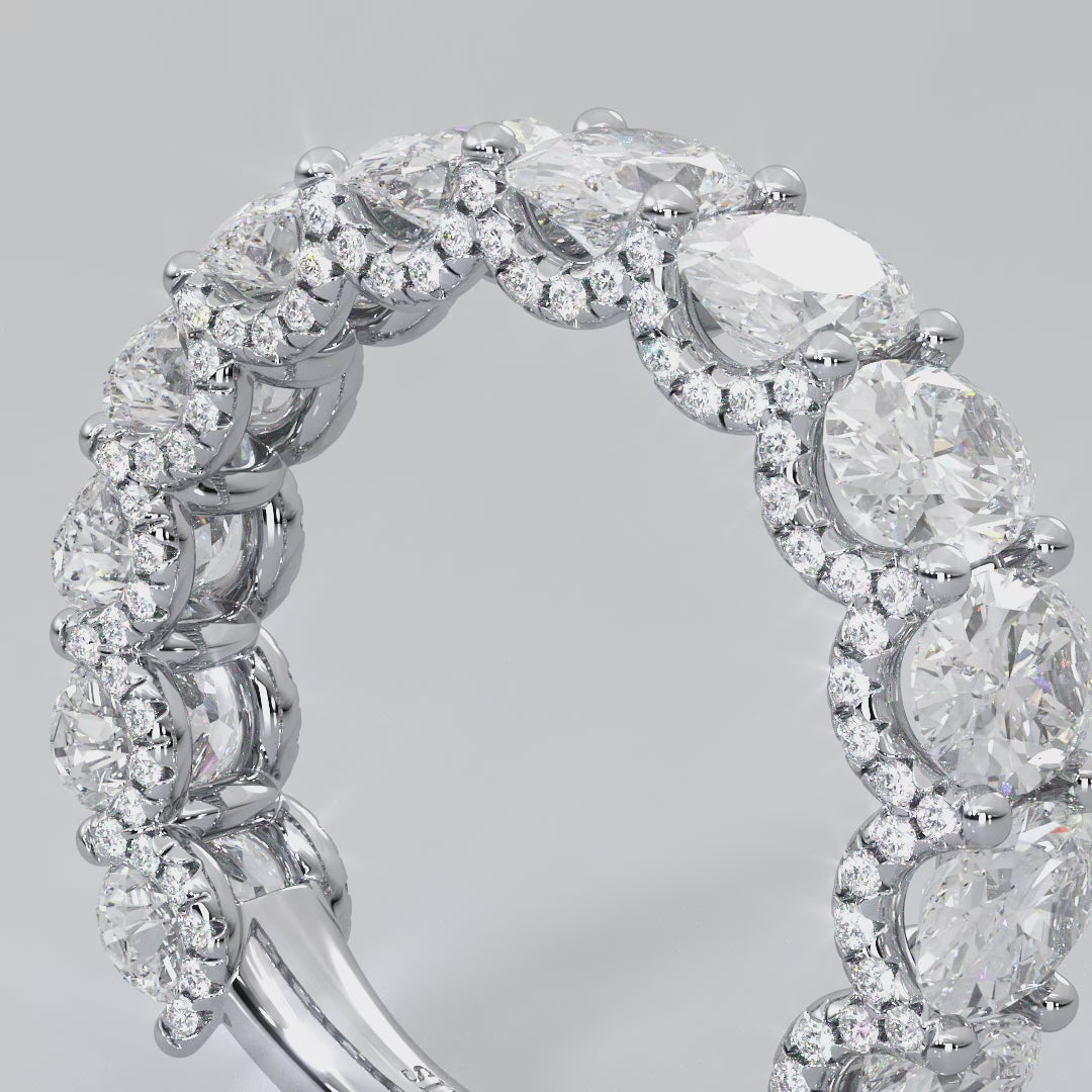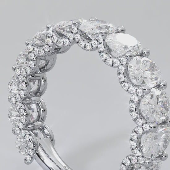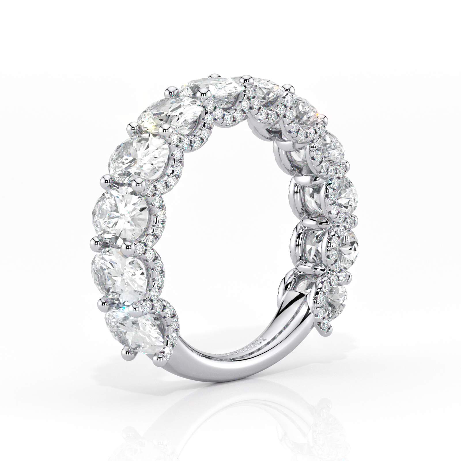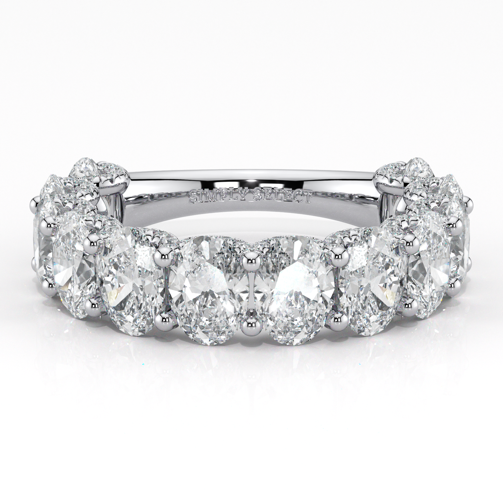 This exquisite women's wedding band showcases 5CTTW, oval cut lab-grown diamonds set in a unique U-shaped design with micro-pave diamonds on the prongs, creating a stunning, fluid curve that perfectly complements the finger. The elegant arrangement of the diamonds offers a timeless, sophisticated look, making this band the perfect symbol of enduring love and commitment. Each Oval stone is .35CT