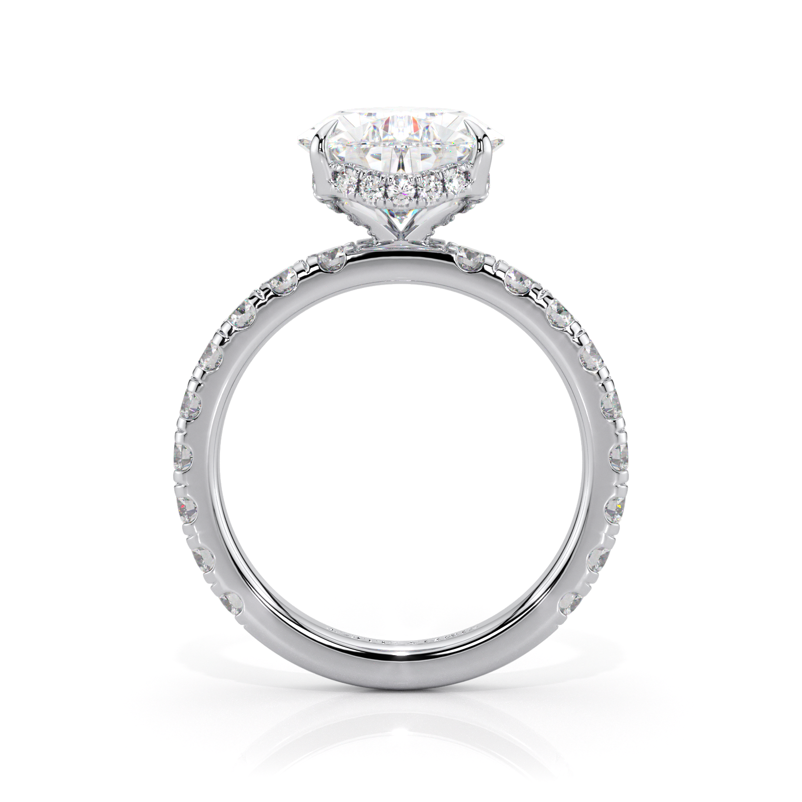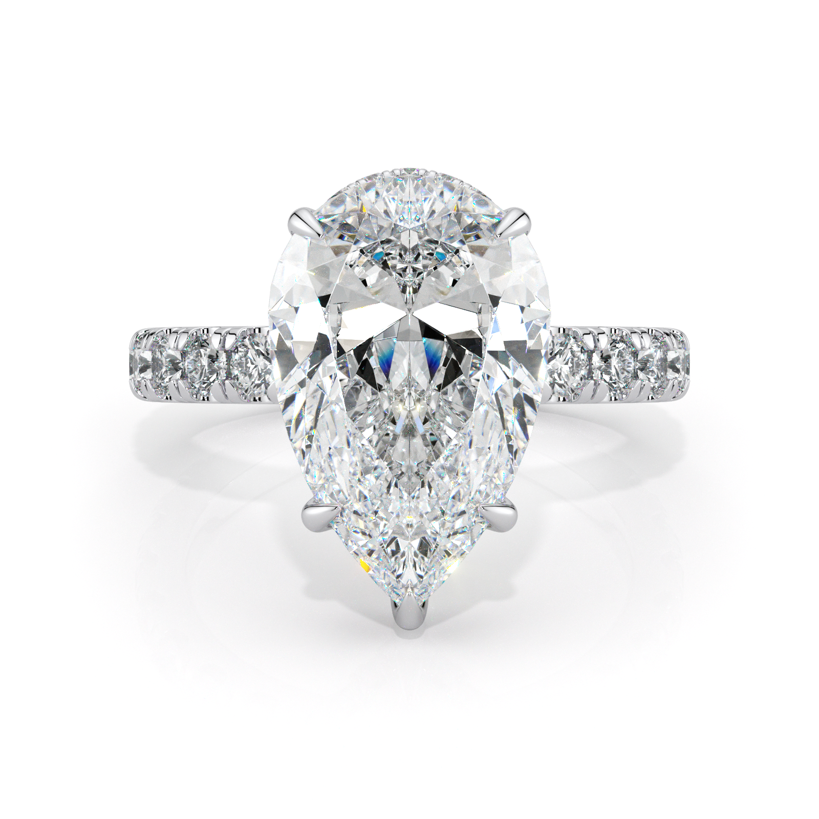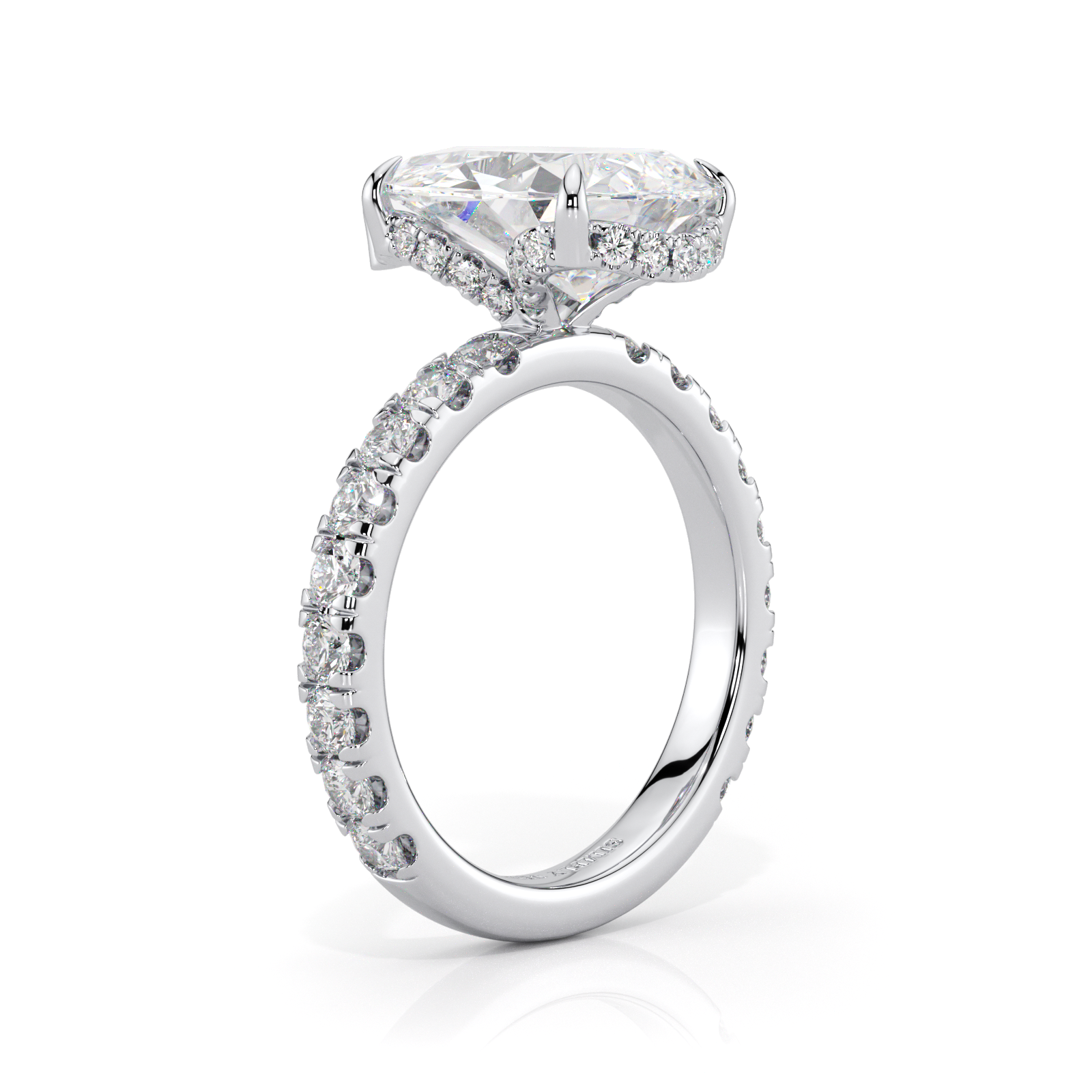 A bold twist on classic elegance. This stunning pear-shaped center diamond is framed by a unique hidden halo—open on one side, closed on the other—for a touch of mystery. Set on a sleek 2mm pavé band with VVS-quality diamonds for maximum sparkle, Aria is luxury redefined.