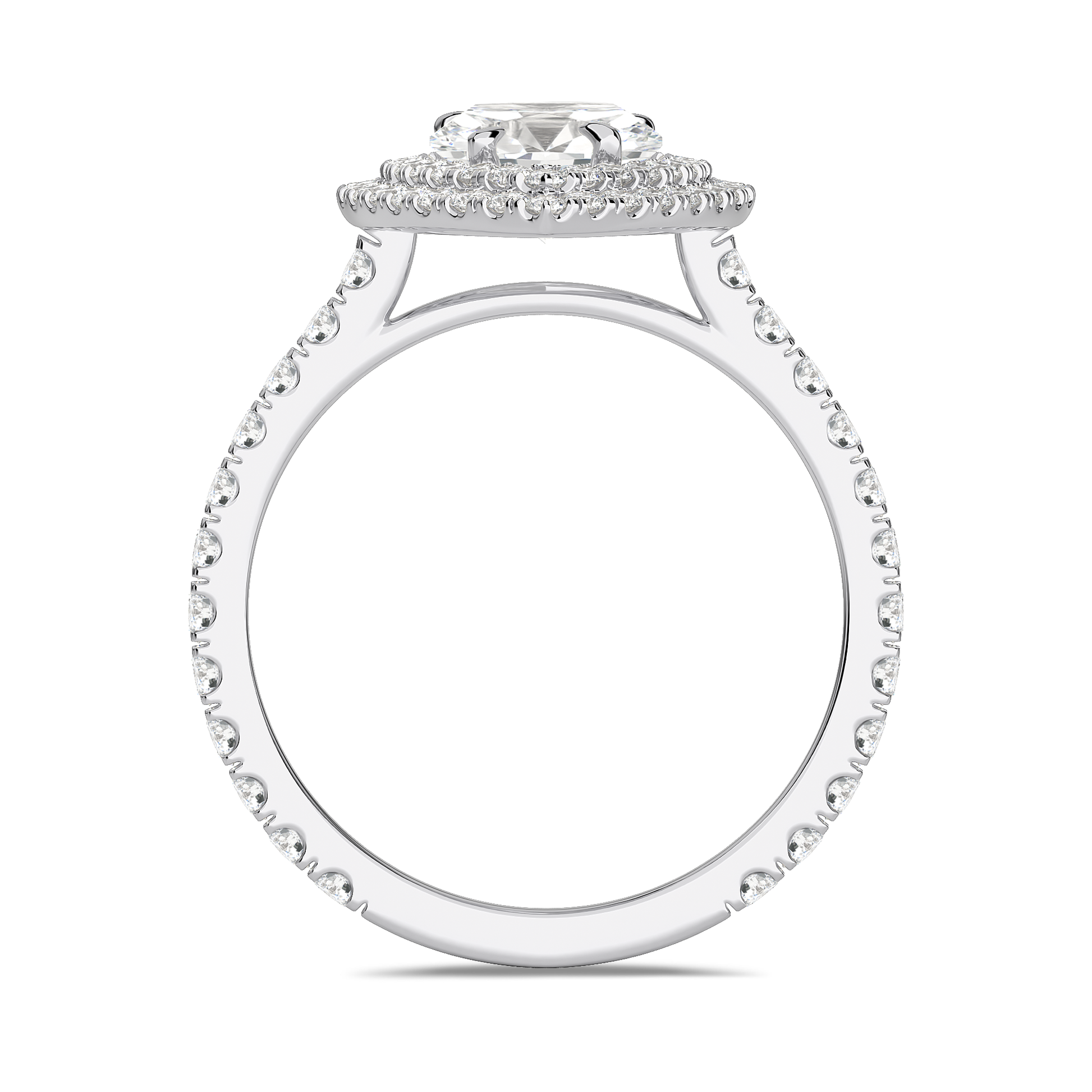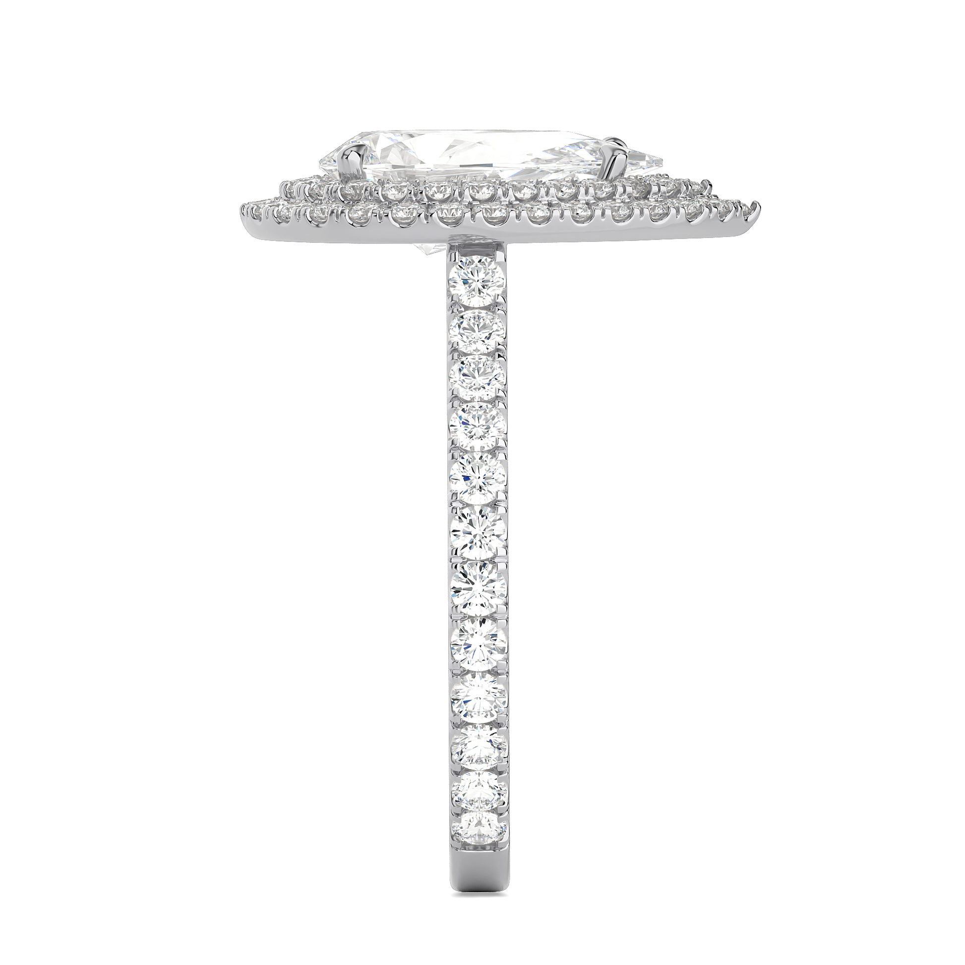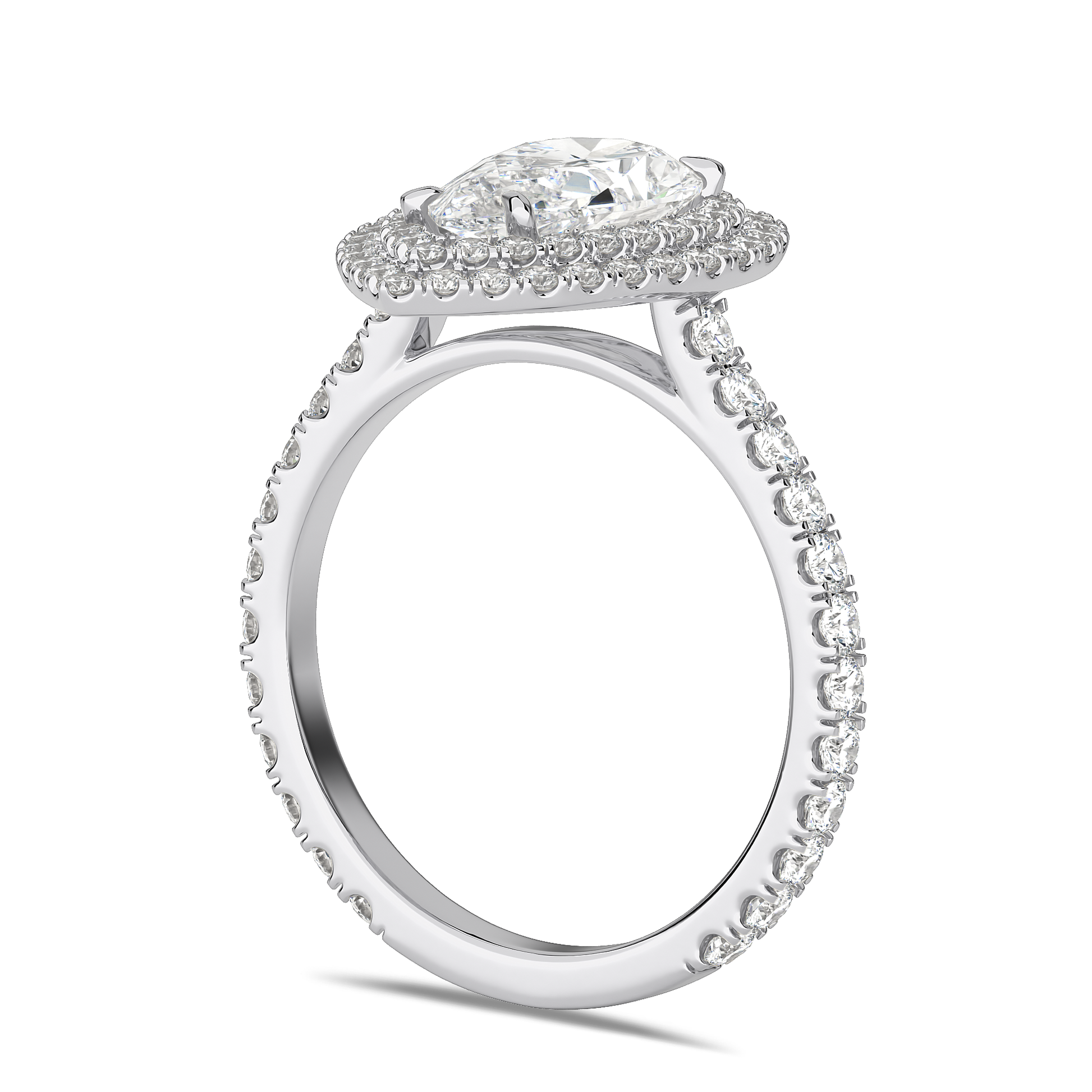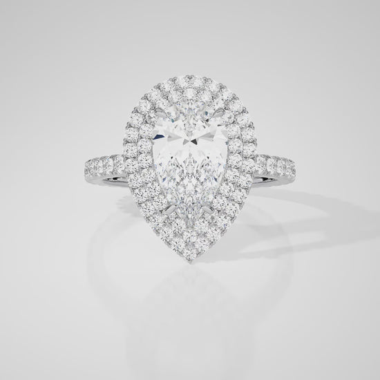 Introducing our breathtaking Becky Ring, a true embodiment of elegance and glamour. Designed to accommodate any size pear-shaped lab-grown center diamond, this ring features a double halo setting that beautifully frames the center stone, adding depth and dimension to its brilliance. Dazzling round diamonds cascade down the band in a micro pave setting, extending three-quarters of the way, creating an irresistible sparkle and shine. With its undeniable beauty and timeless appeal, this ring is sure to captivate hearts and make a statement of everlasting love and devotion.