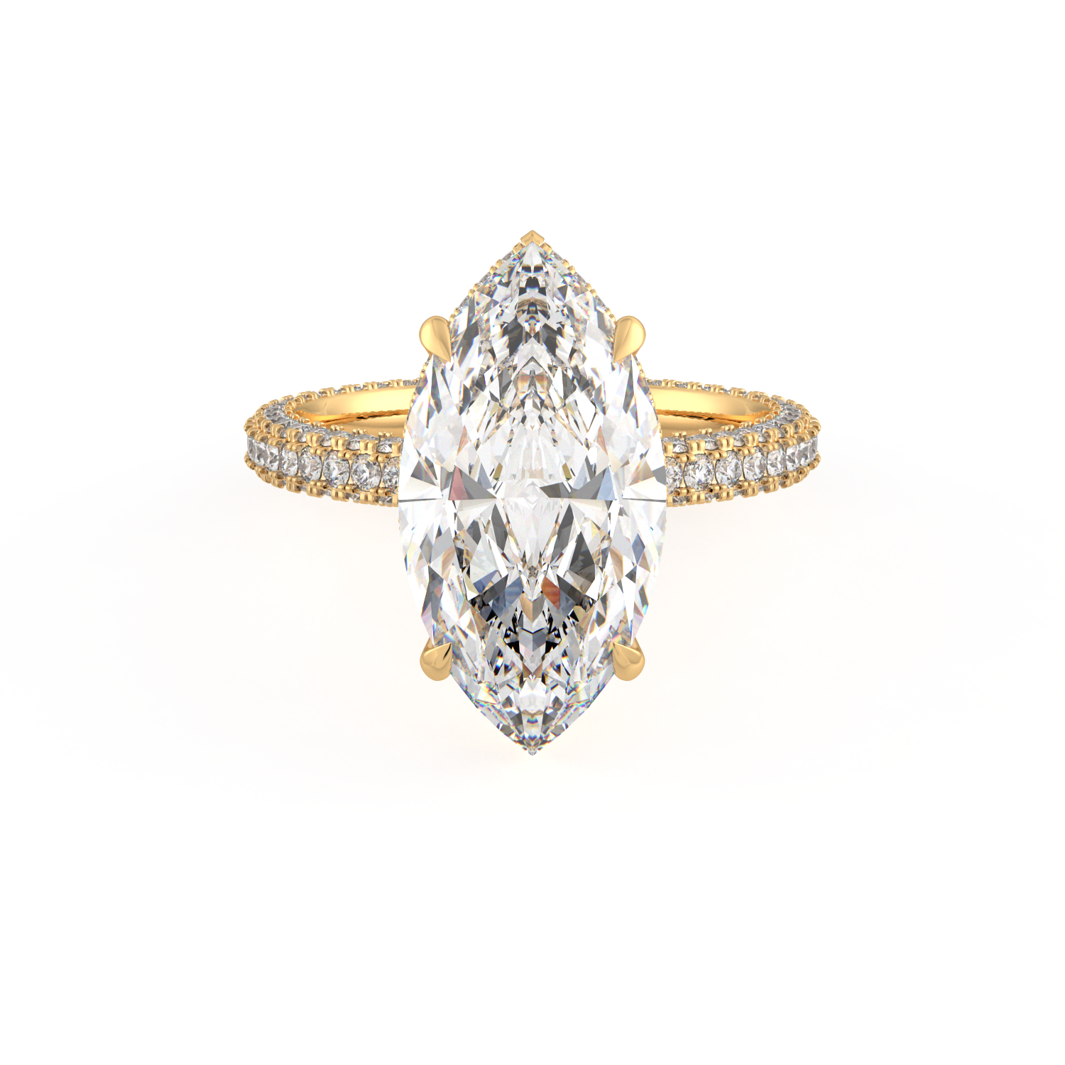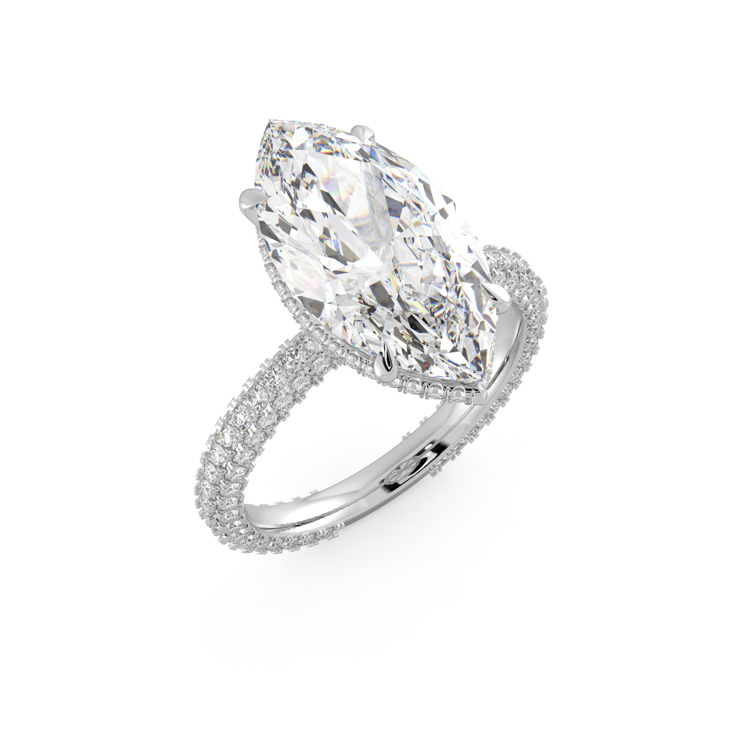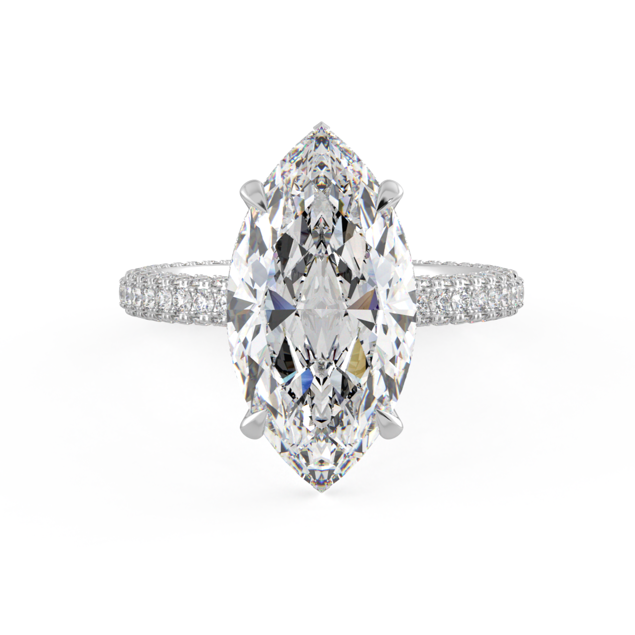 Introducing our exquisite Camille Engagement Ring, a dazzling testament to love and romance. This stunning ring features a marquise lab-grown center stone, delicately set on a micro-pave three-row band adorned with diamonds on the prong and hidden halo. The intricate design of this ring ensures maximum sparkle from every angle, making it an absolute must-have for any future fiancé. With its captivating beauty and timeless elegance, this ring is the perfect choice for celebrating your love and embarking on a journey together.