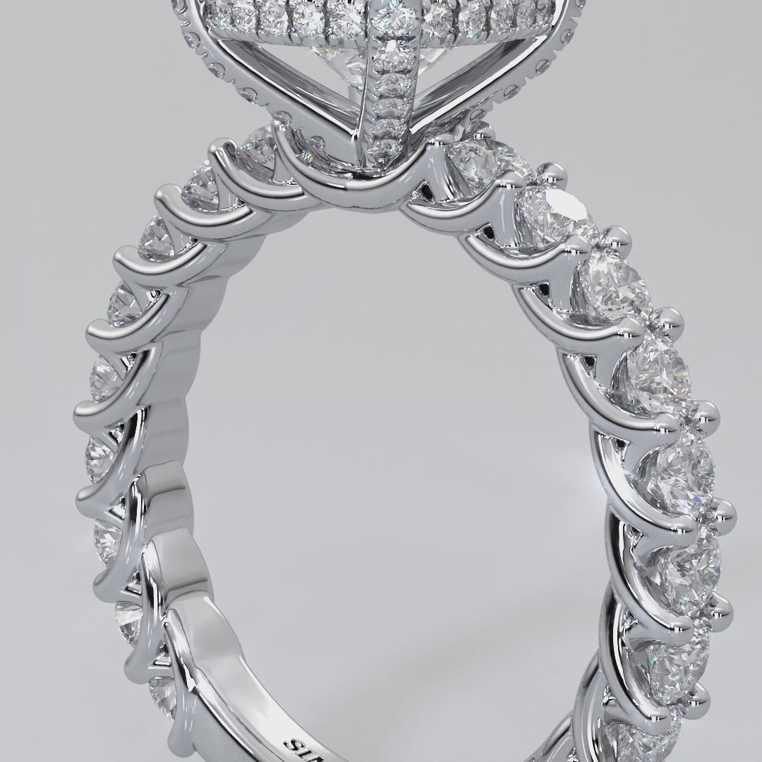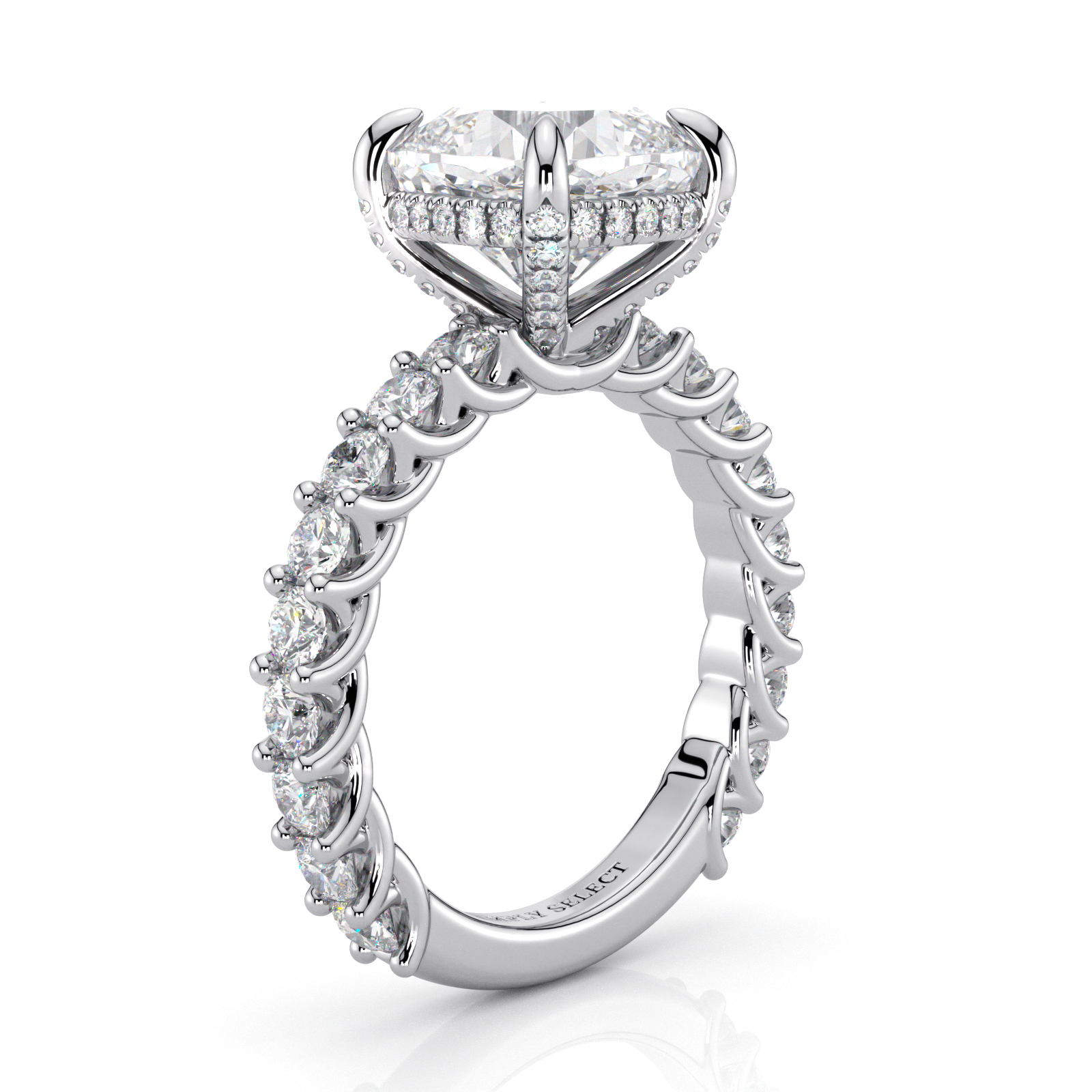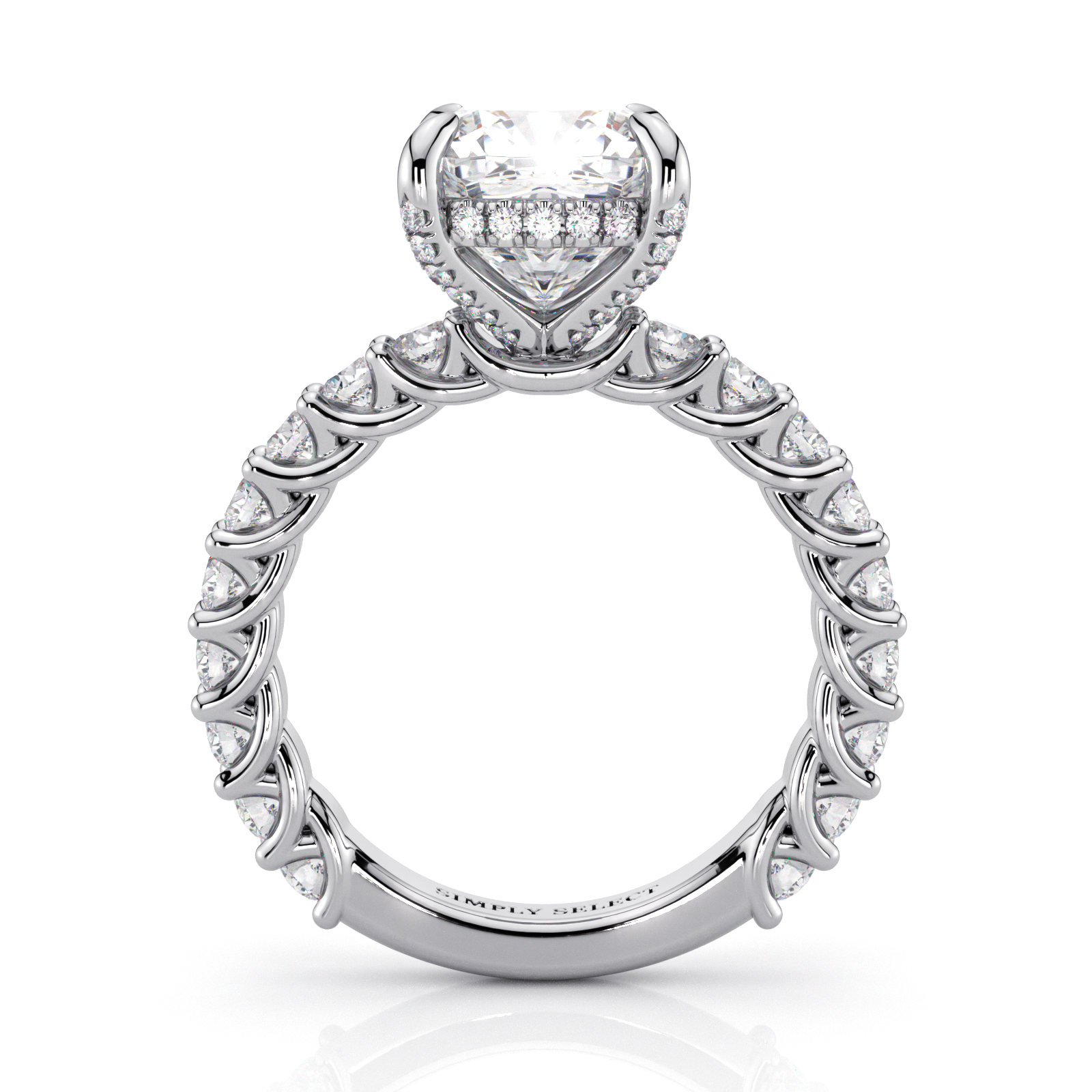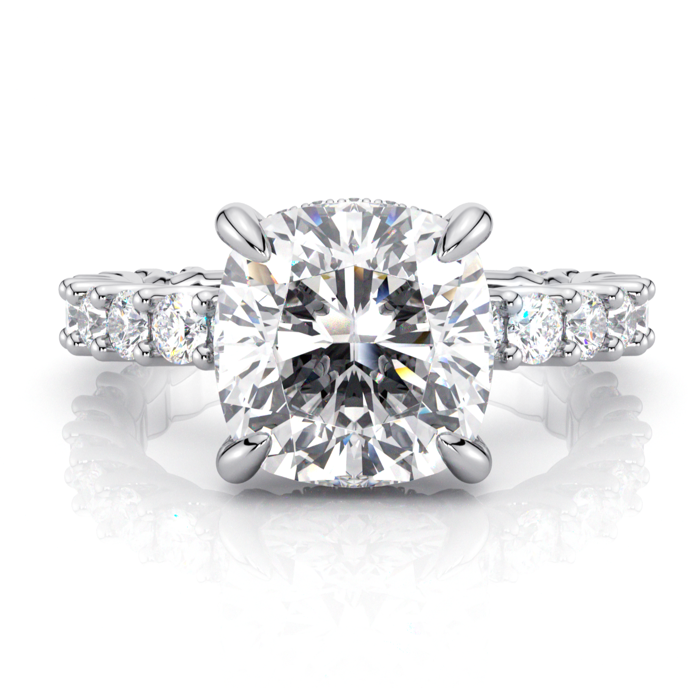 At the center of attention sits a square cushion lab-grown center stone, delicately cradled by a hidden halo, adding a touch of allure and brilliance to the ring. With its unique design and bold presence, the Emma Engagement Ring is sure to make a statement wherever you go, embodying confidence and style.