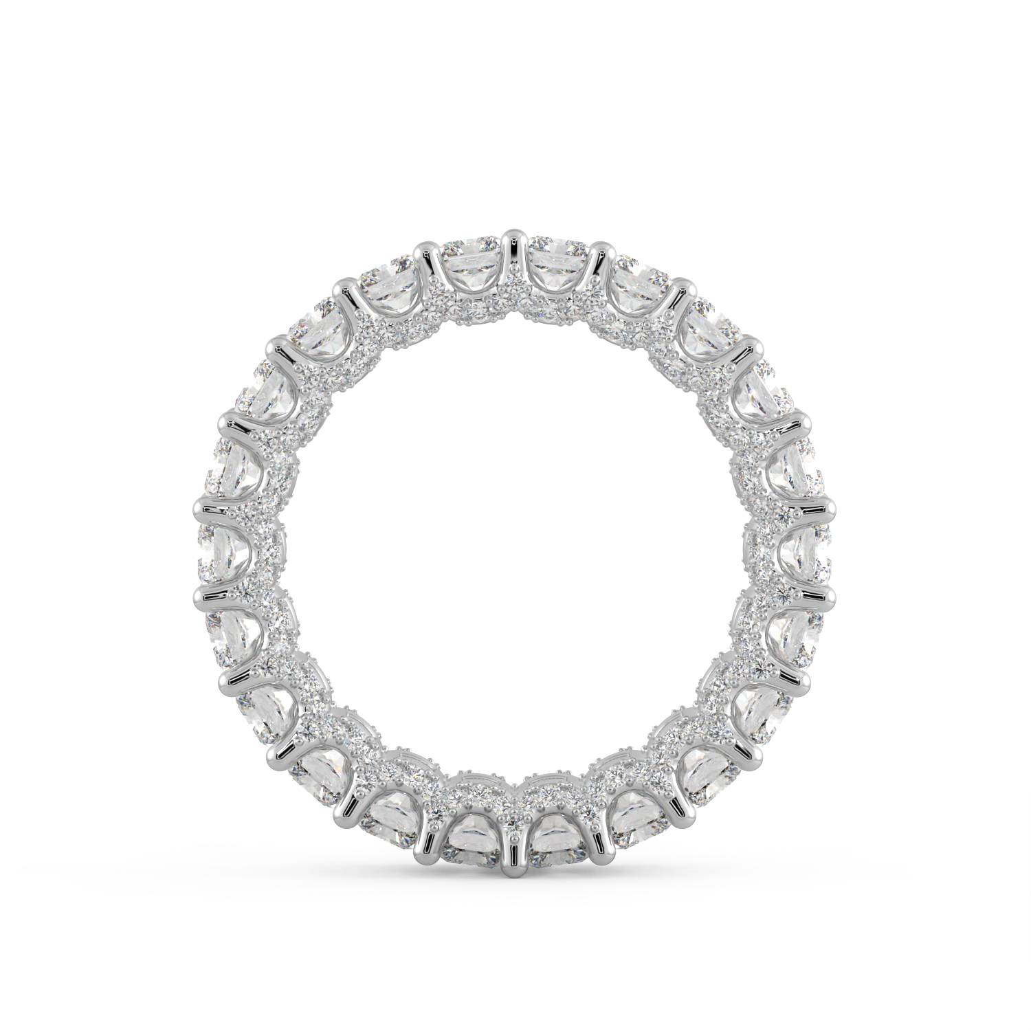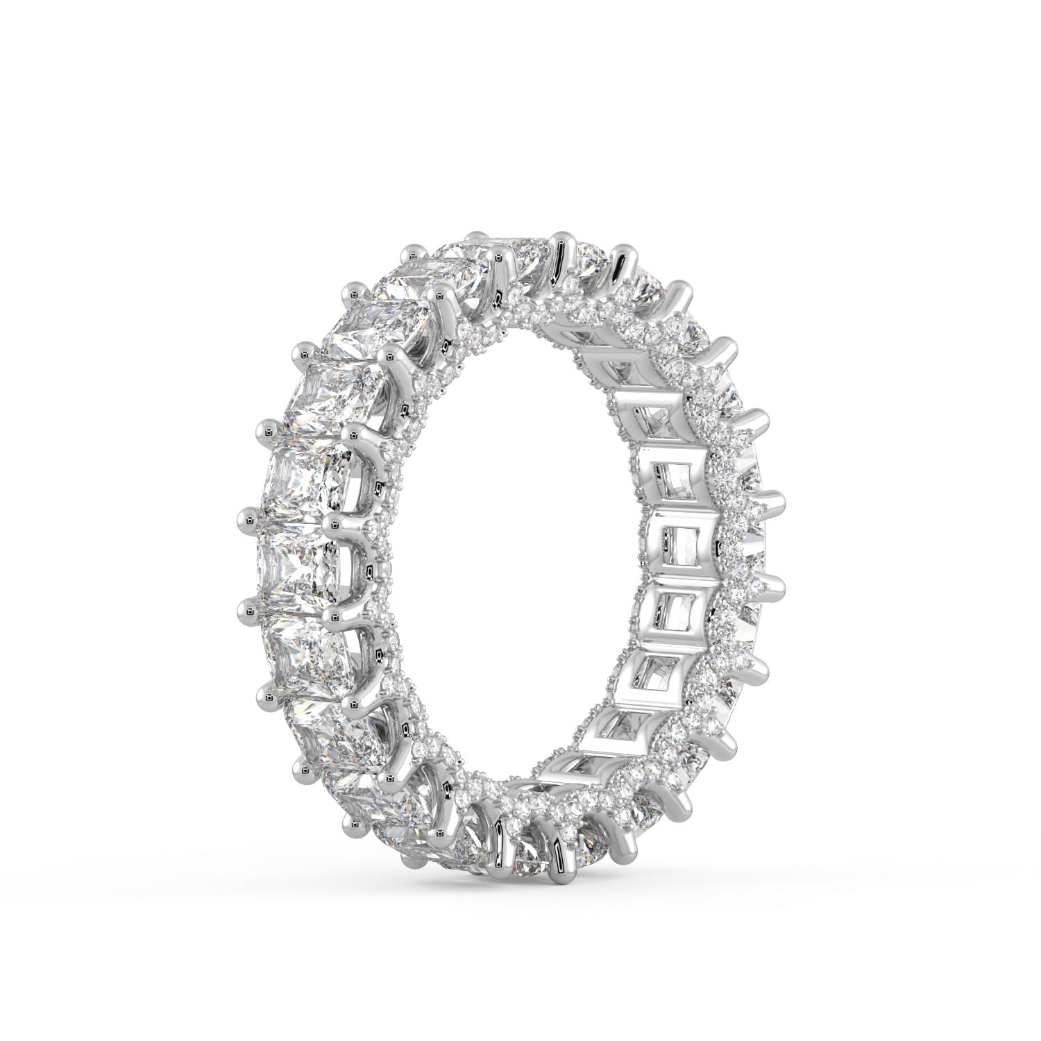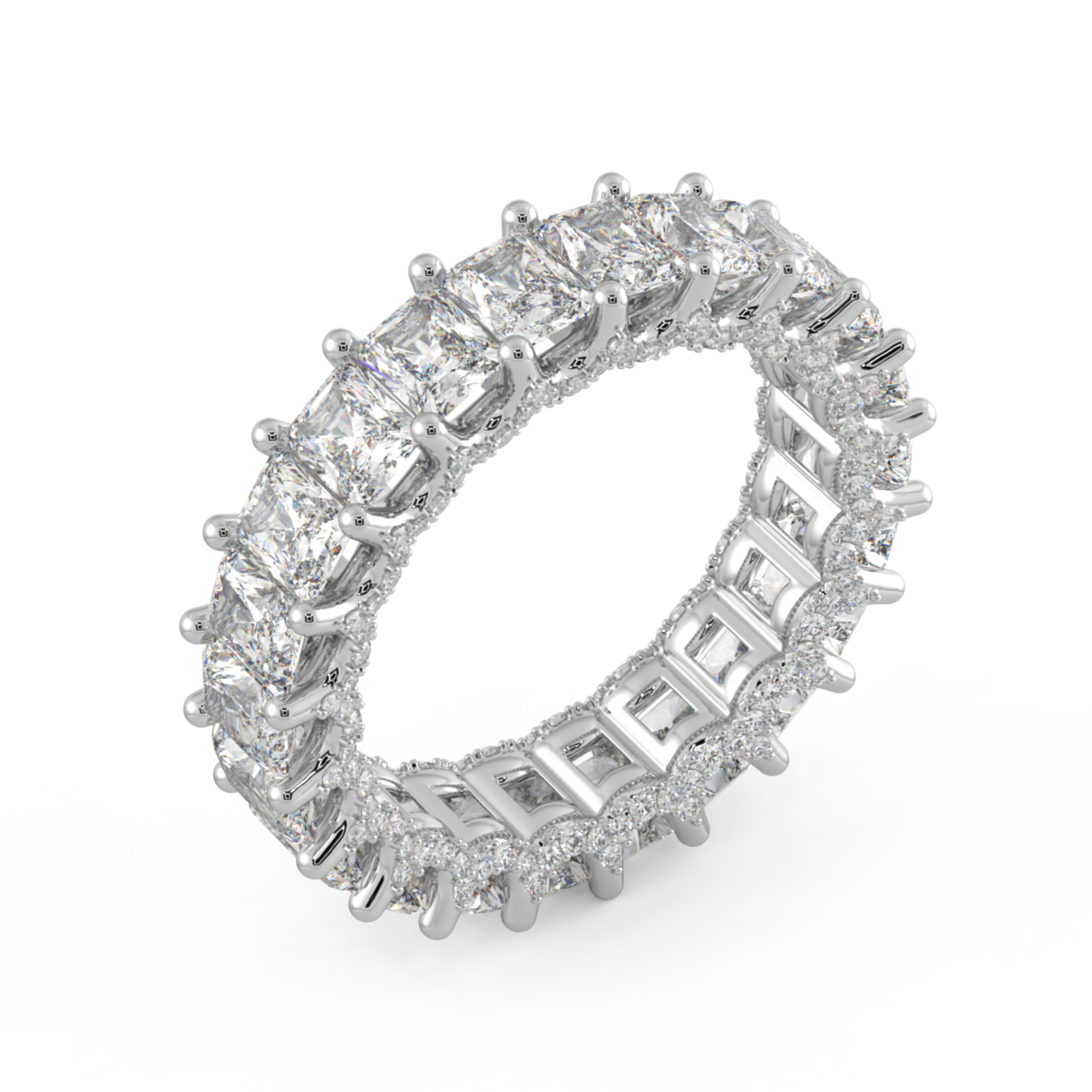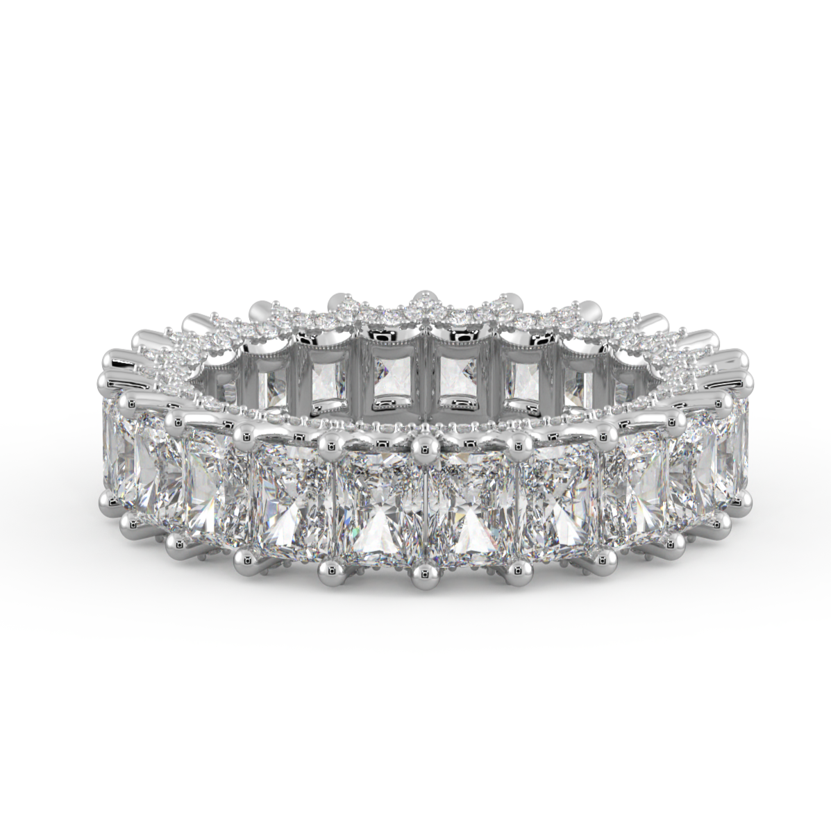 This stunning wedding band features a Radiant Lab Grown Diamond Eternity Band with pave diamond on the pongs. Each radiant diamond is .20CT with a total weight of 5CT. All D/E color VVS quality diamonds. Pair it with our Crystal ring for the perfect set!
