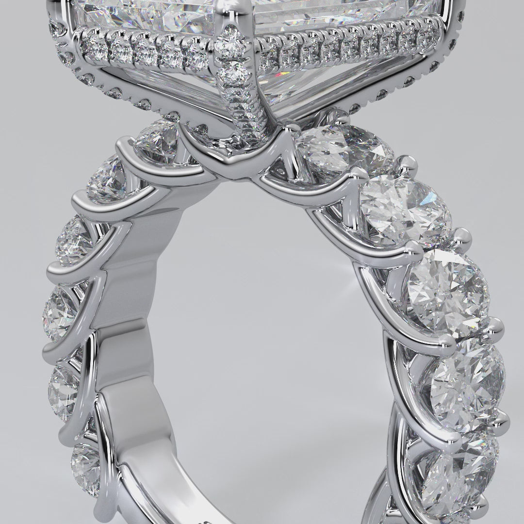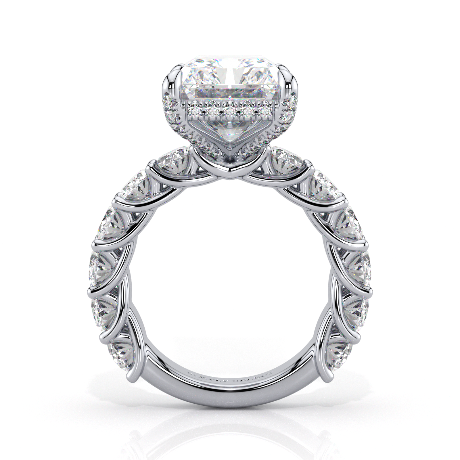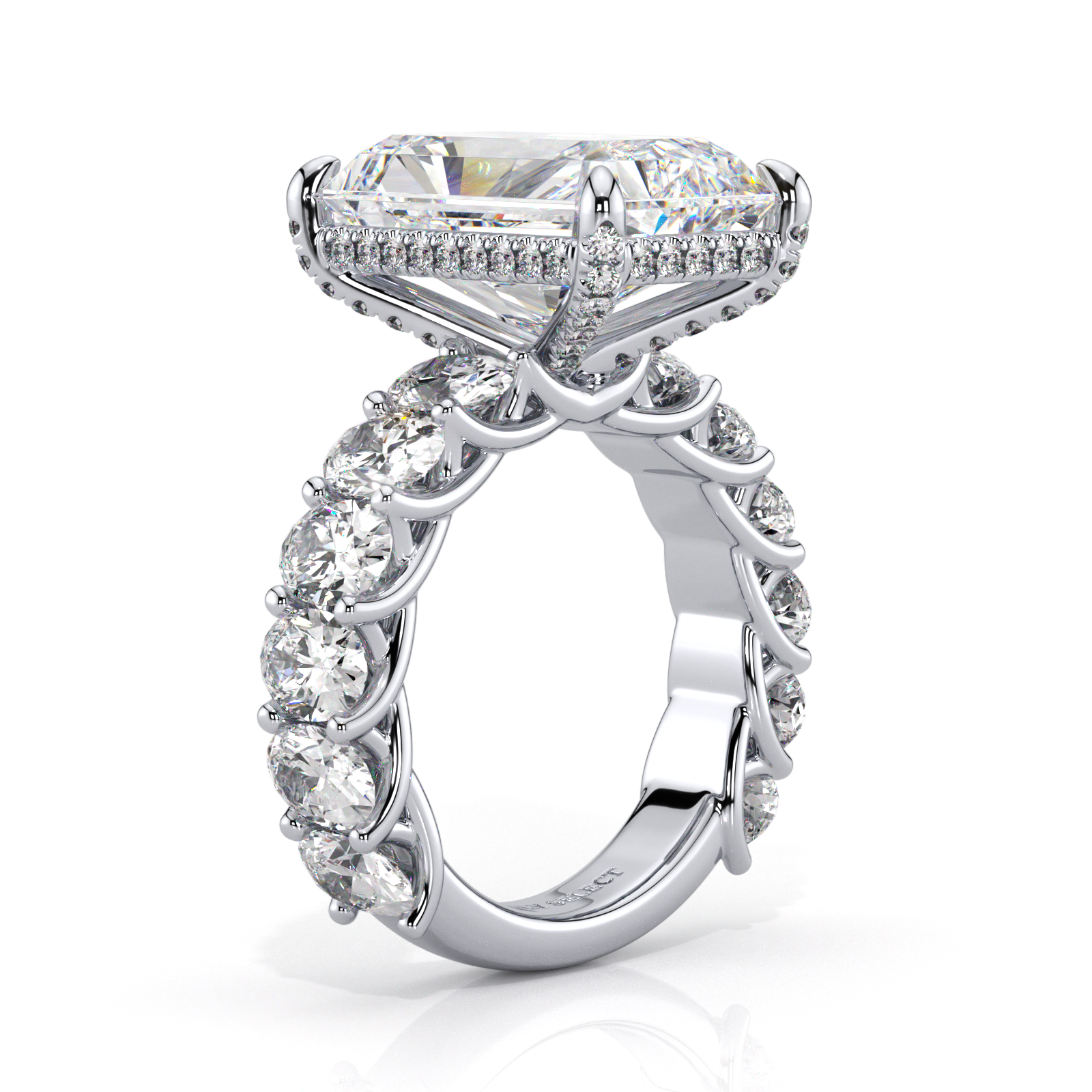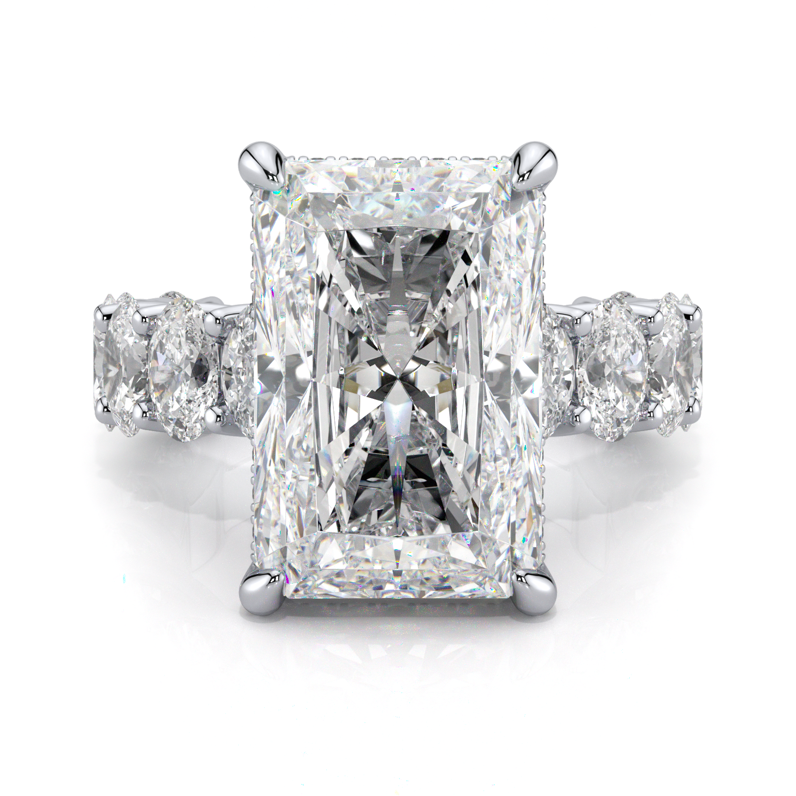 This stunning engagement ring features a radiant cut lab-grown diamond center stone, complemented by elegant oval-shaped diamonds on the band. With a total weight of 2.25CT of D/E VVS quality lab diamonds, this design offers the perfect balance of brilliance and sophistication. The total carat weight will increase based on your selected center stone size, giving you the best of both worlds—classic beauty and dazzling sparkle. Pair it with the Ashley wedding band for the perfect set!