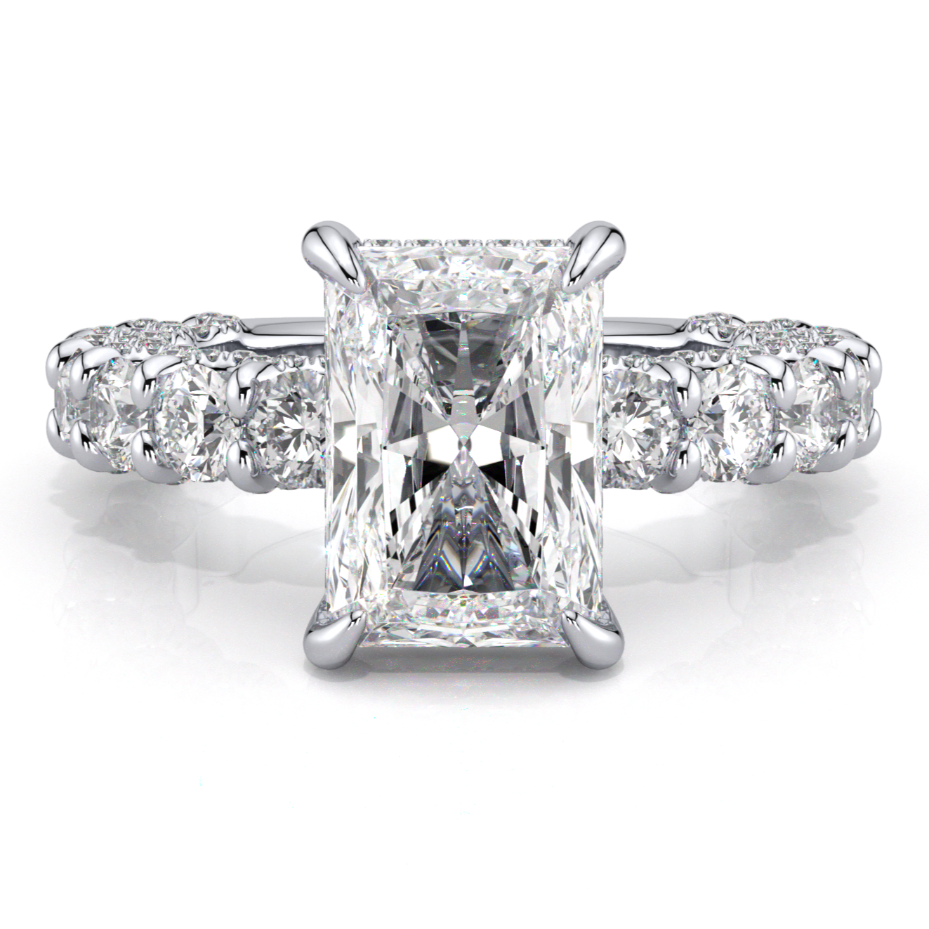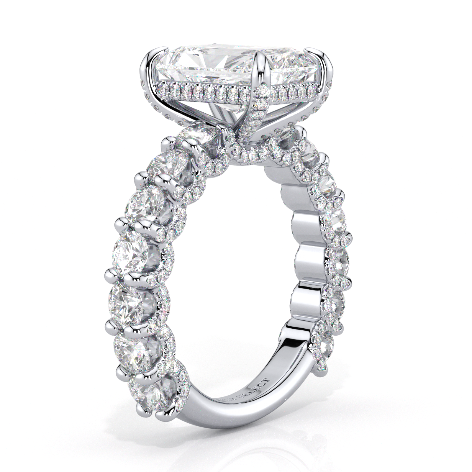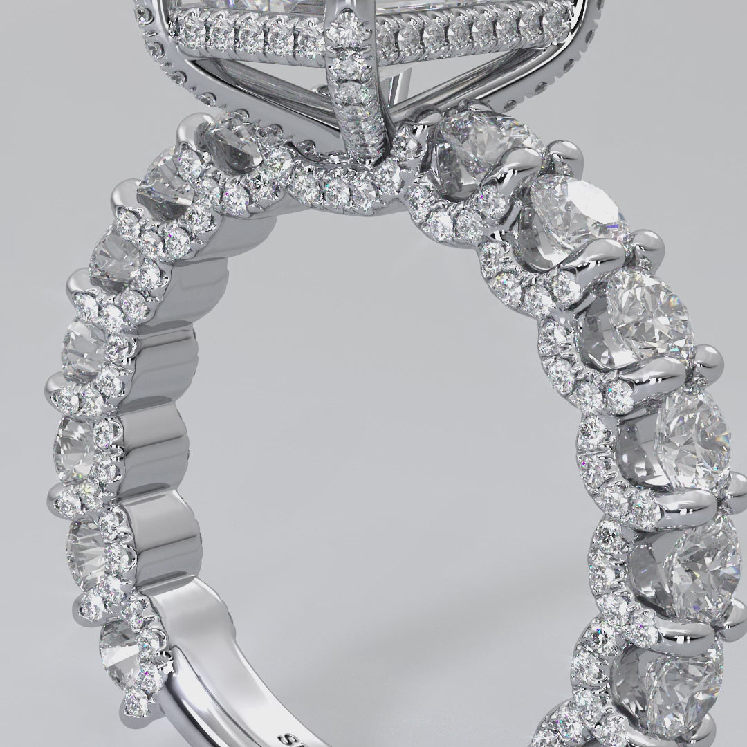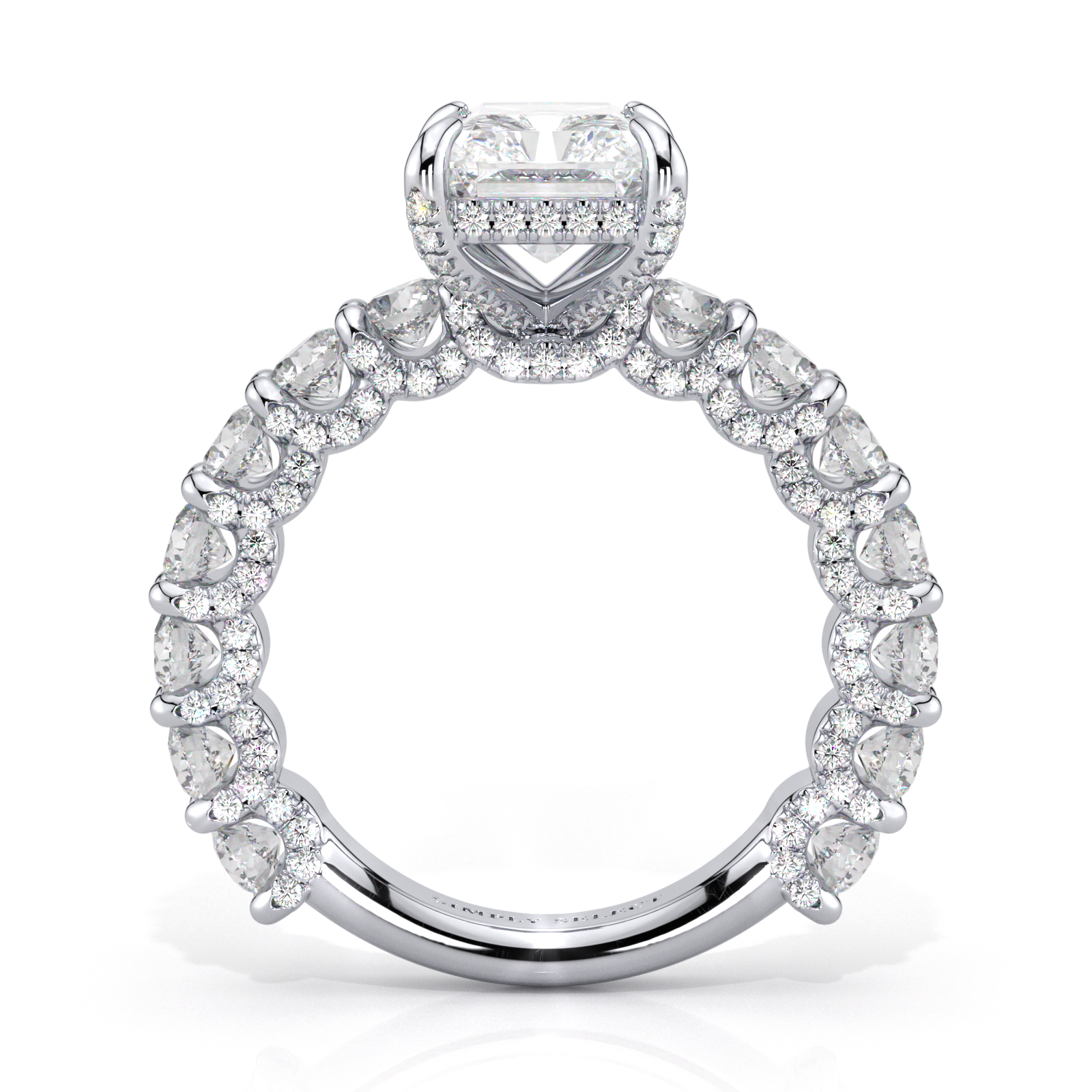 The setting of this beautiful ring is adorned with .10CT round diamonds, creating a shimmering display of brilliance. Pave diamonds on the prongs holding the center stone and the band add an extra layer of sparkle and elegance. From every angle, this ring exudes an icy allure that is sure to mesmerize.
