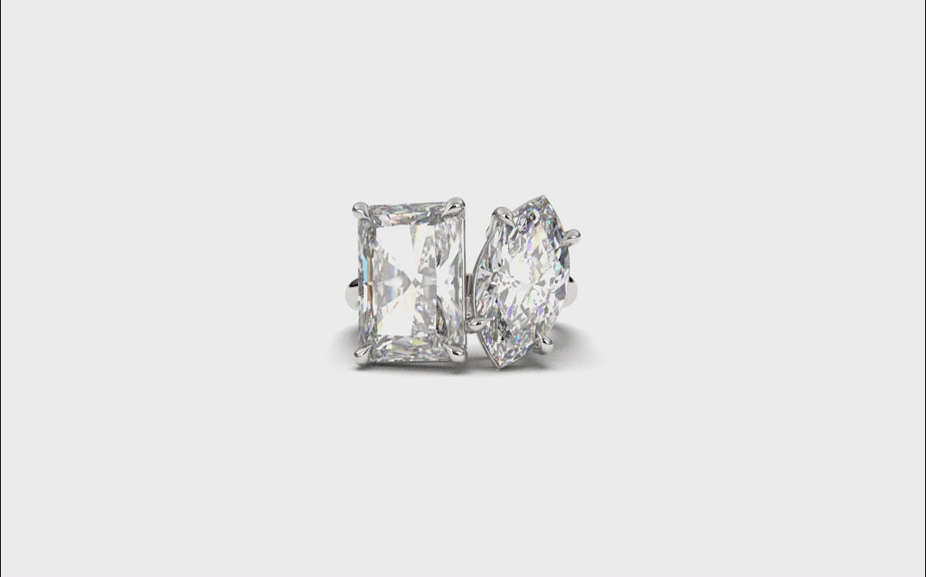 Introducing our mesmerizing Two Stone Jasmine Ring, a captivating symbol of eternal love and harmony. This stunning ring features a radiant lab-grown diamond and a marquise lab-grown diamond, delicately set on a simple solitaire setting.