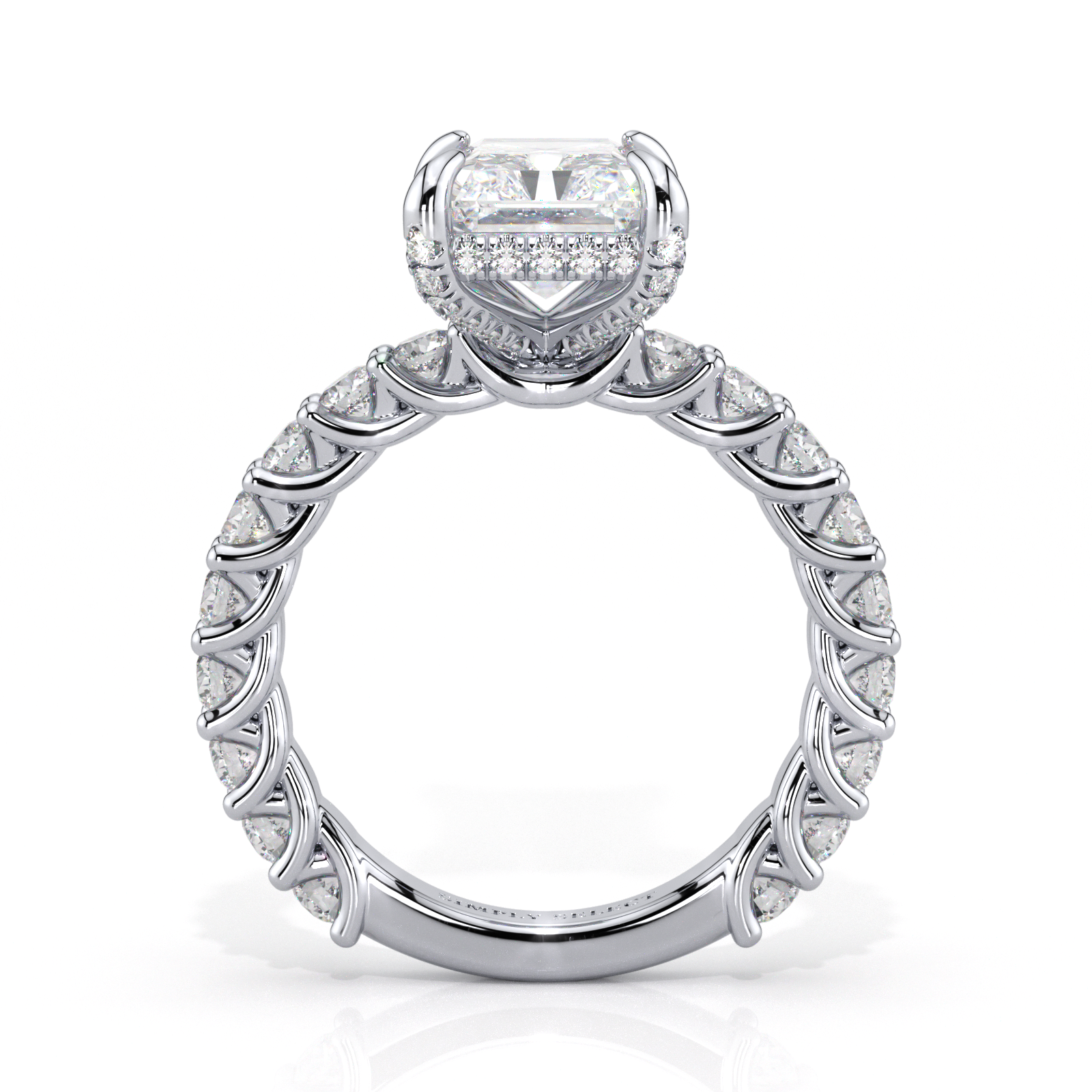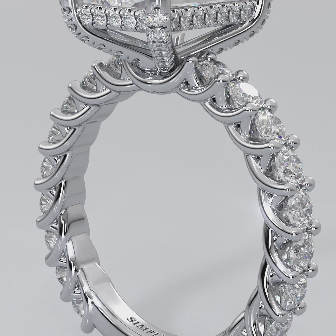 The halo extends halfway up the prongs, adding maximum glamour and brilliance to the center stone. Additional round brilliant cut natural diamonds are pave-set down three-quarters of the thick 2.5mm band, creating a breathtaking display of sparkle and sophistication. This design is given a unique twist U shape style to see every angle of the diamond set on the band giving it maximum sparkle