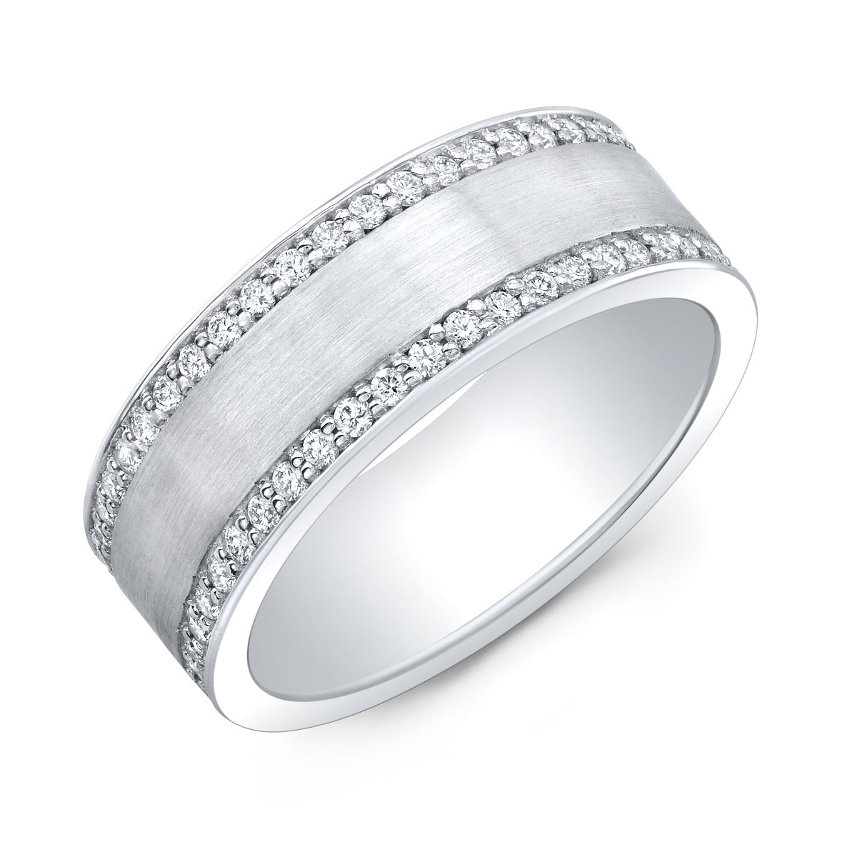 This distinctive and luxurious round-cut men's diamond ring is an essential addition to any jewelry collection. Featuring two rows of diamonds that encircle the entire brushed finish band, this stylish eternity ring exudes sophistication. The softly rounded inner edges ensure a comfortable fit, while the 8MM width and 1.25CT of D/E VVS quality lab-grown diamonds enhance its refined appeal.