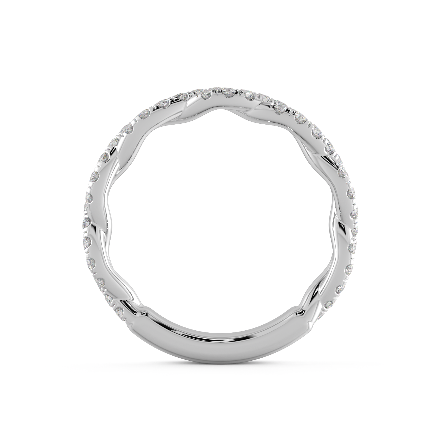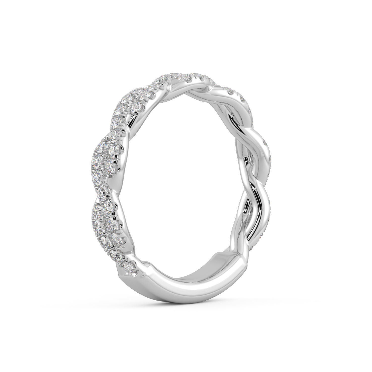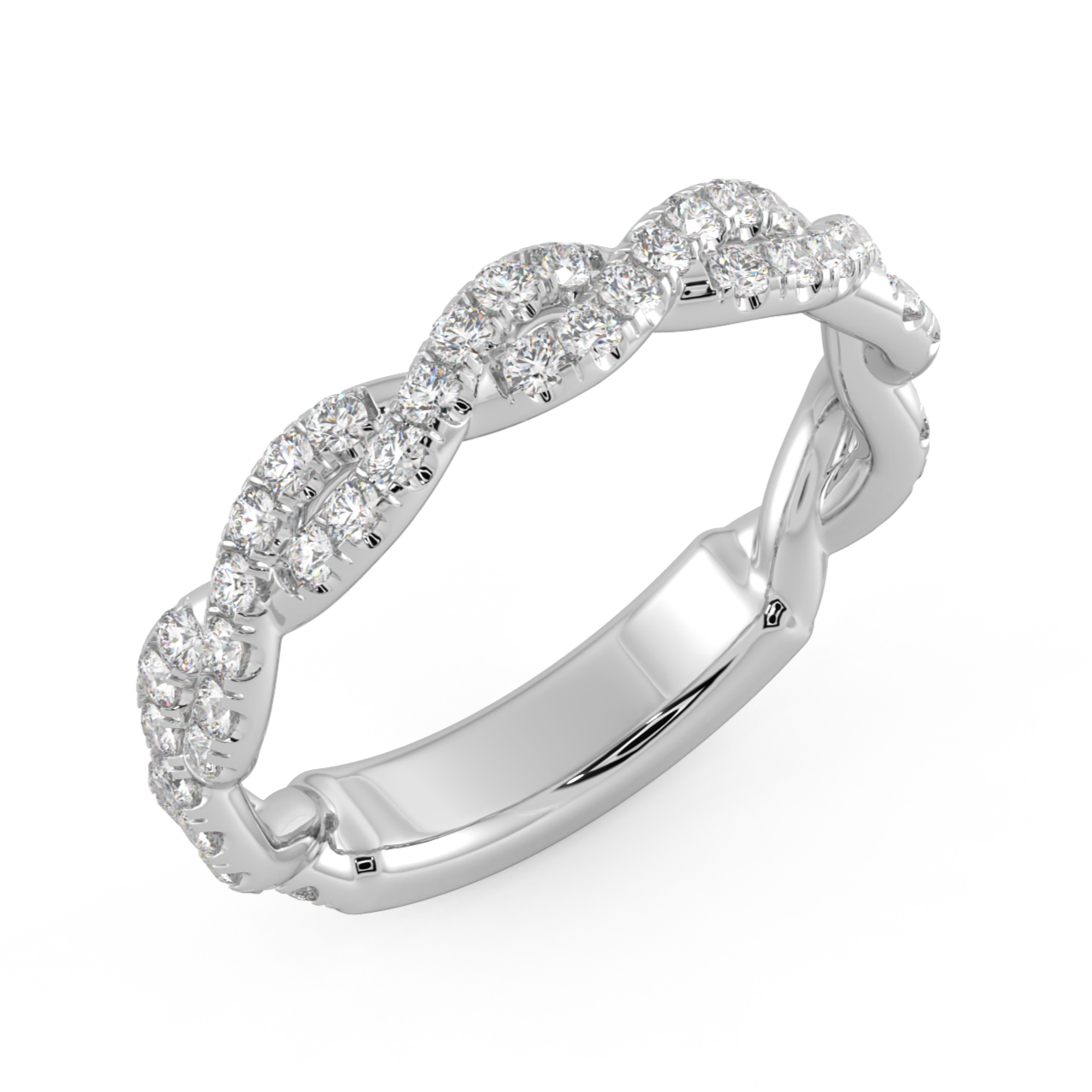 This wedding band features a twist style with diamonds on the twist going 3/4 way down. This band has a total weight of .75CT of diamonds E/F color VS quality.
