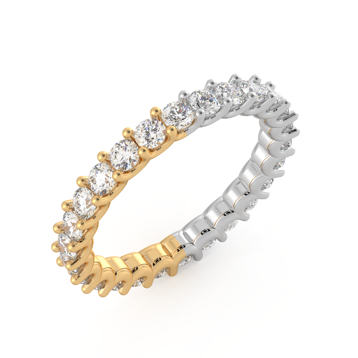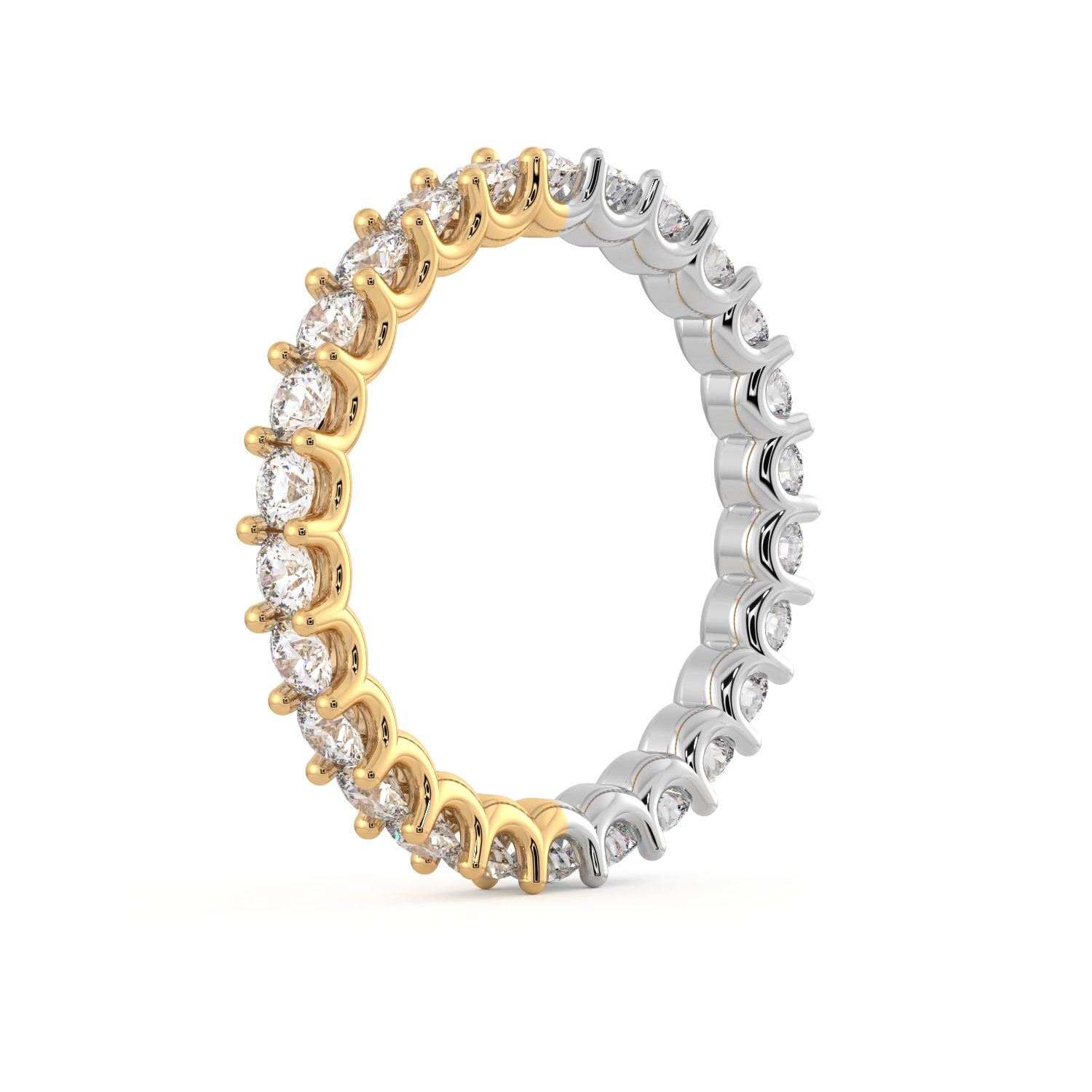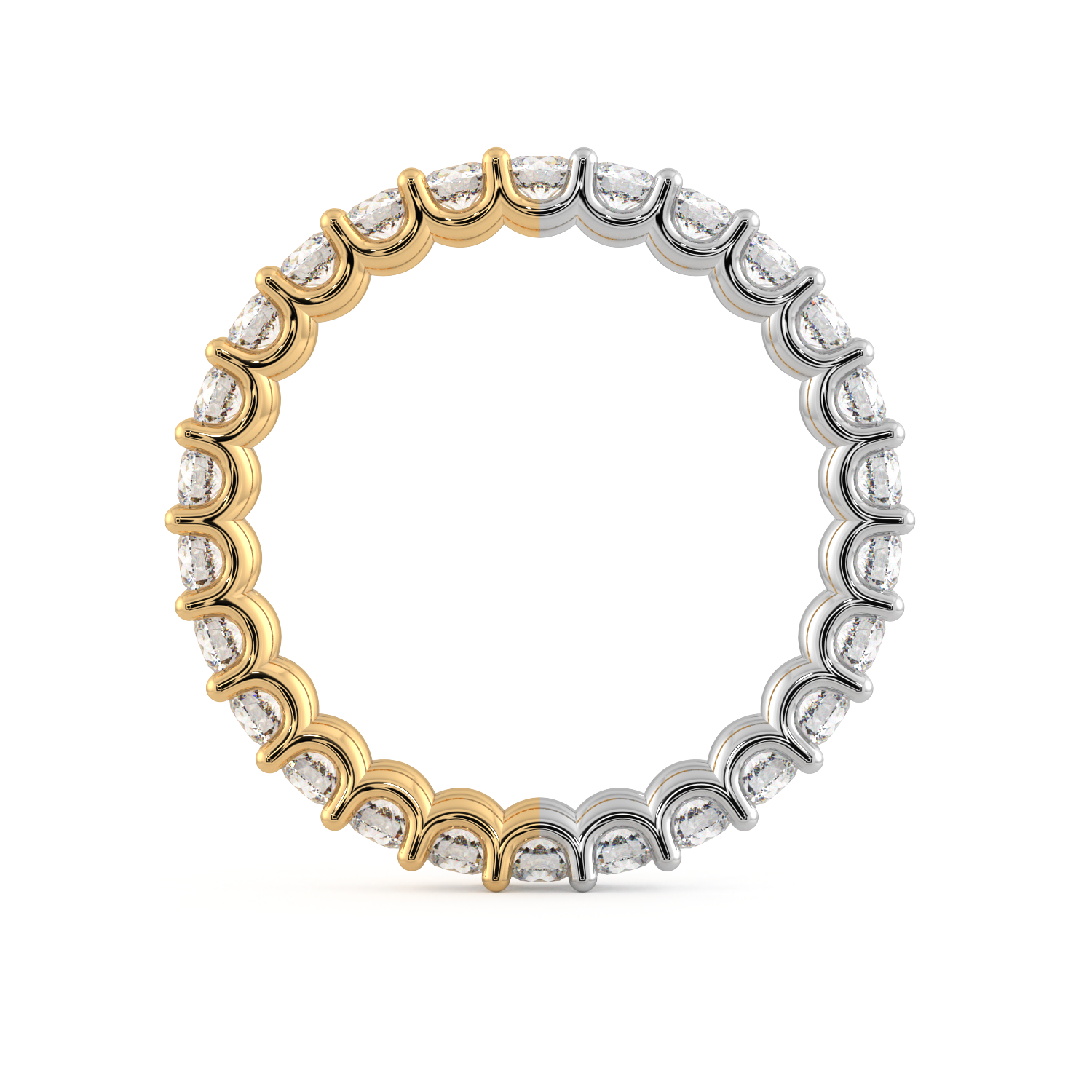 This stunning wedding band features a U shape style set diamonds on a full eternity band. This wedding band features a total weight of 1CT. This band can be made in all white, yellow, rose, or two-tone! Pair this with the Julia for the perfect set!