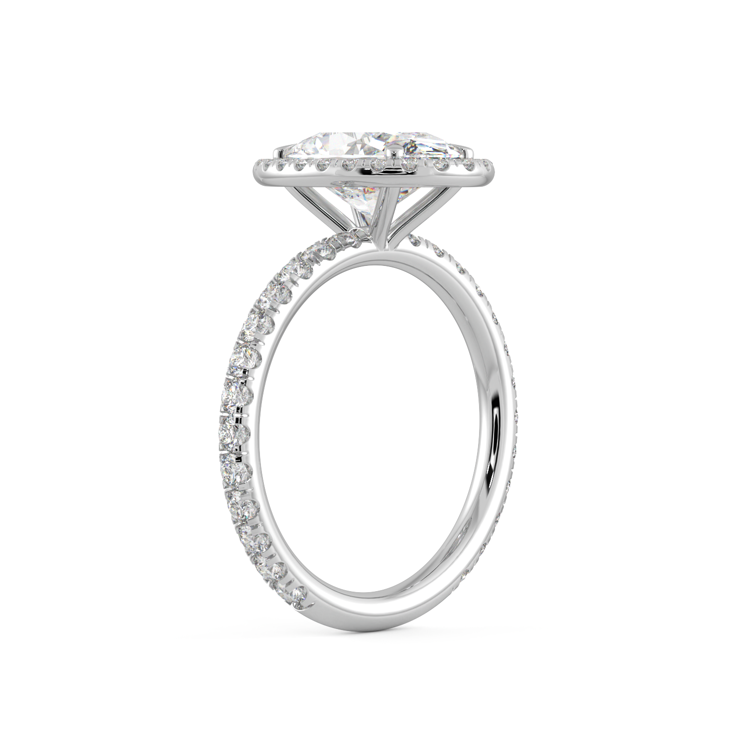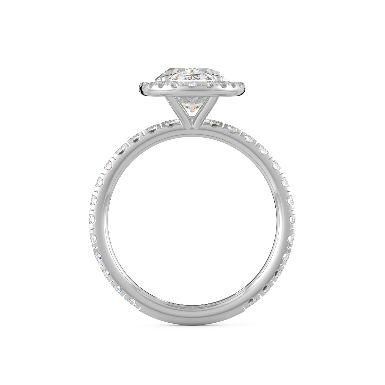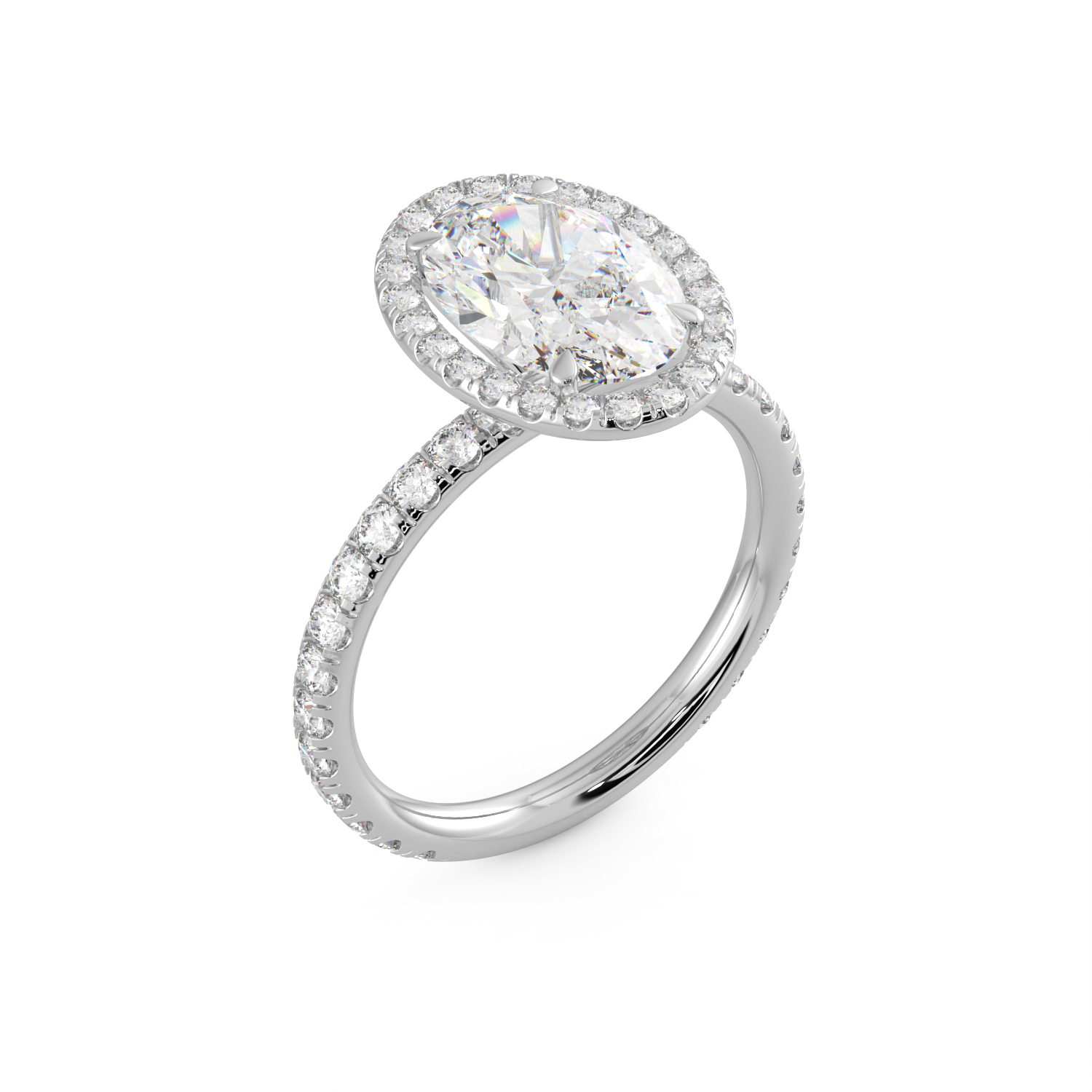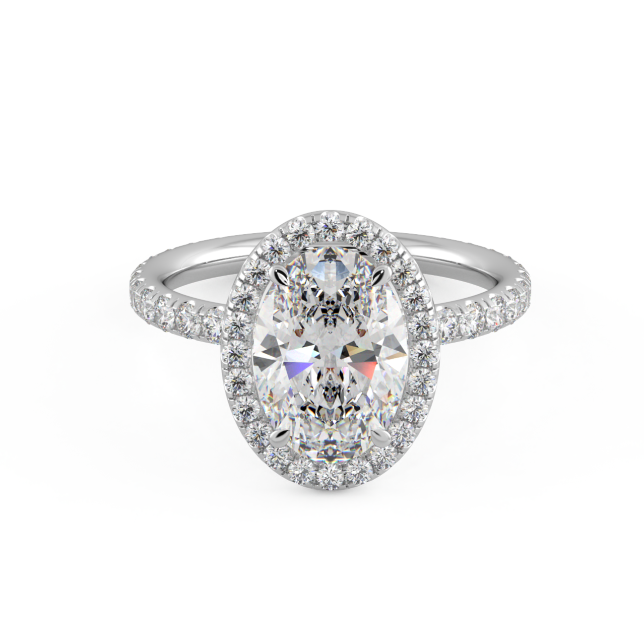 The halo setting boasts a 2mm diamond band with a tight halo that envelops the oval center stone, creating a visually larger and more radiant appearance. We adore halo engagement rings for their timeless allure, and this exquisite ring is no exception. It awaits your future fiancé, ready to be cherished for a lifetime of love and happiness.